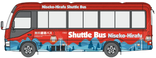 「Niseko-Hirafu Shuttle Bus」と書いてある赤いマイクロバスがパークアンドバスライドのバスです。