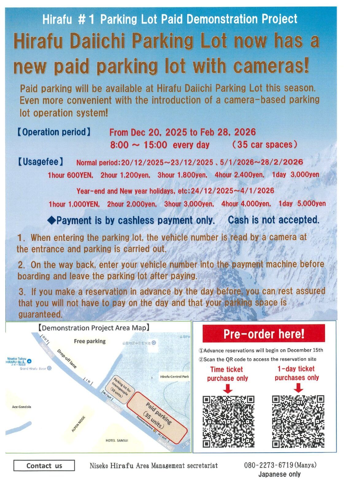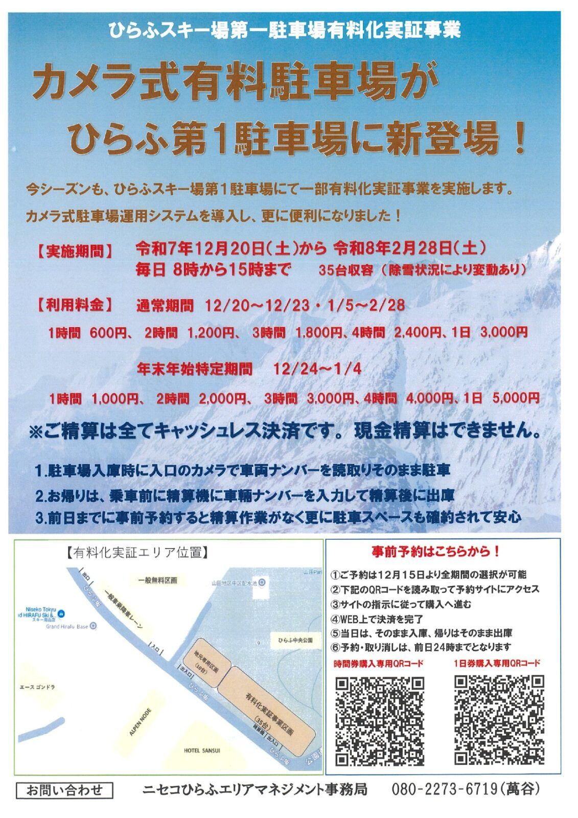 2025.12.12 冬 お知らせ 交通情報 【ひらふ第一駐車場】カメラ式有料駐車場 新登場! 今シーズンも、ひらふスキー場第1駐車場にて一部有料化実証事業を実施します。カメラ式駐車場運用システムを導入し、更に便利になりました! 運用開始は、12月20日より2月28日までの71日間となります。※予約開始は、12月15日~ チラシはこちら 下記より駐車場の様子をリアルタイムで確認できます。 LIVE ■お問合せニセコひらふエリアマネジメント事務局 080-2273-6719(萬谷)