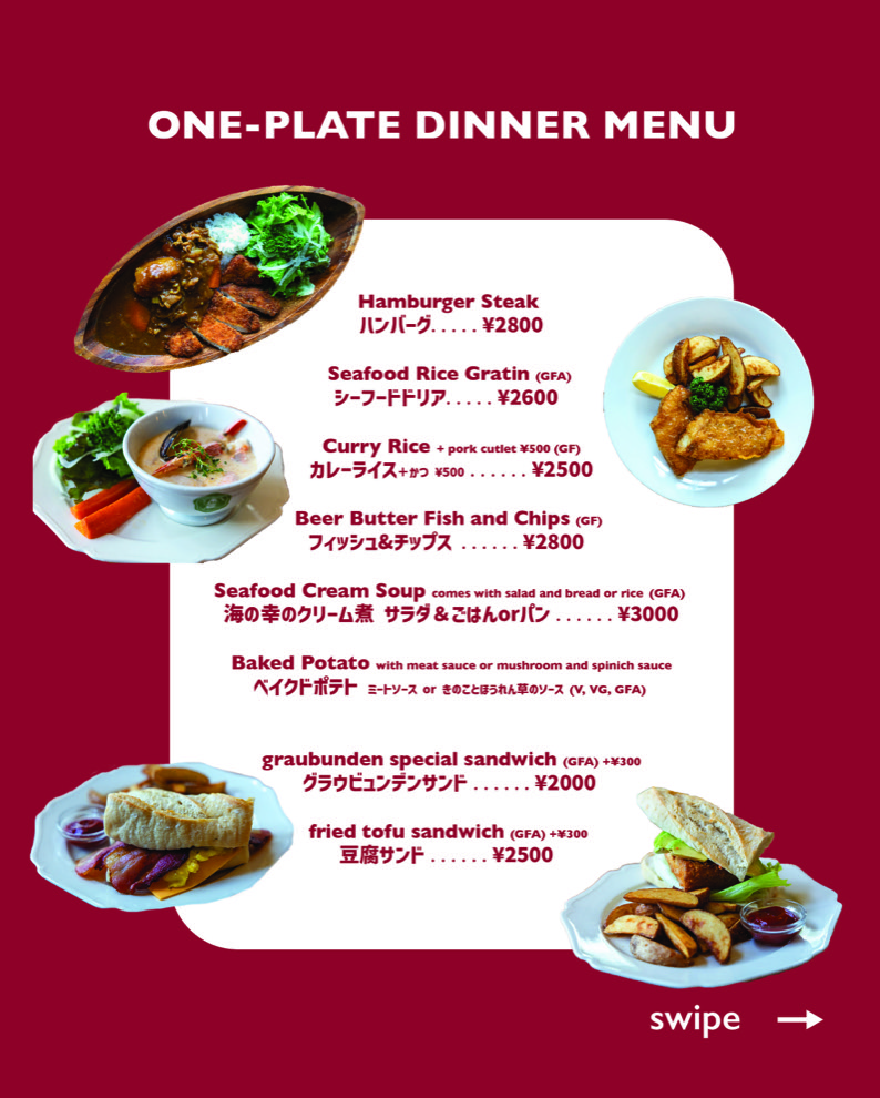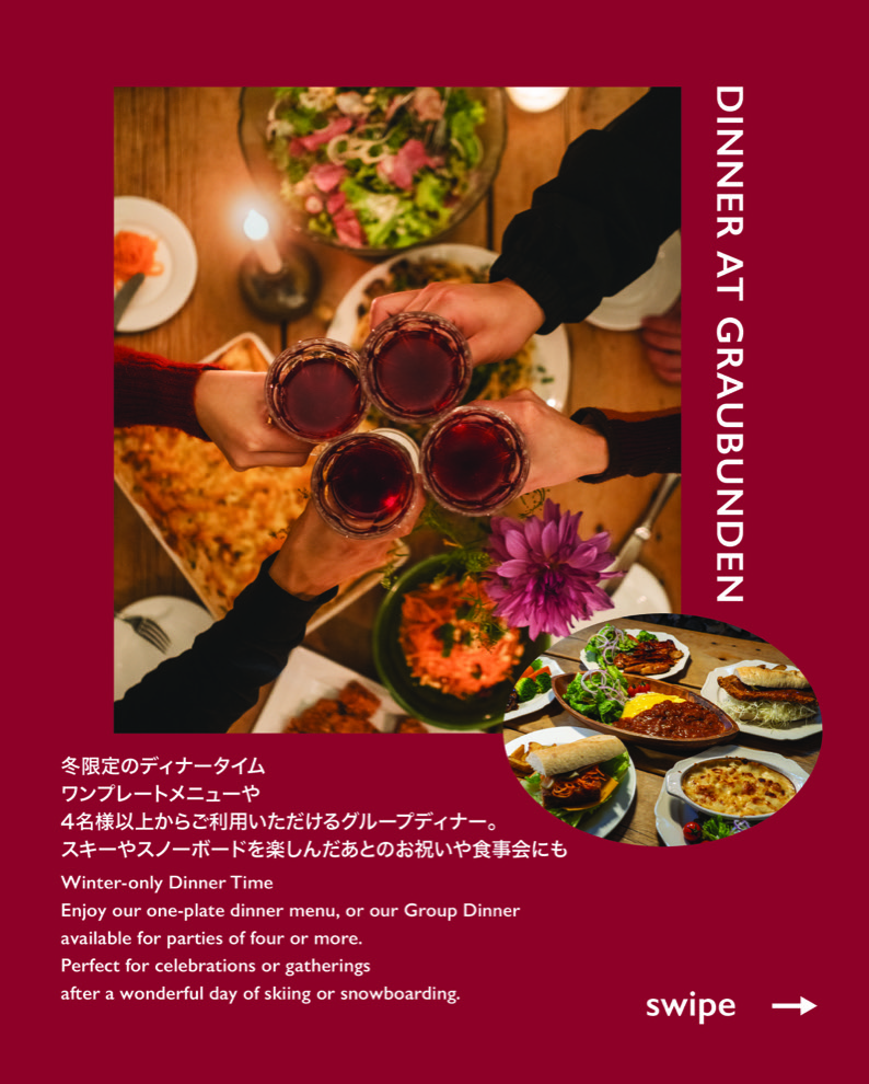 2025.12.24 冬 観光情報 冬限定!ディナープランスタート!【グラウビュンデン】 ニセコの人気カフェ「グラウビュンデン」にて、今年も冬限定のディナープランがスタートしました!お一人様や少人数でも気軽に楽しめる「ワンプレートメニュー」に加え、4名様以上でワイワイ楽しめる「グループディナー」、30名~35名様の貸切プランもご用意しています。アフタースキーの打ち上げや、大切なお祝い、ご友人との楽しいお食事会にぴったりです。人気のケーキもデザートにぜひどうぞ!冬の夜はグラウビュンデンで、美味しいひとときをお過ごしください。